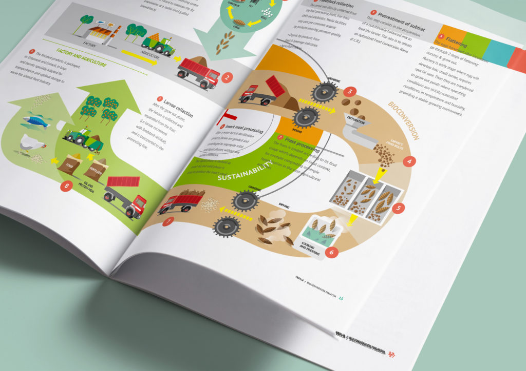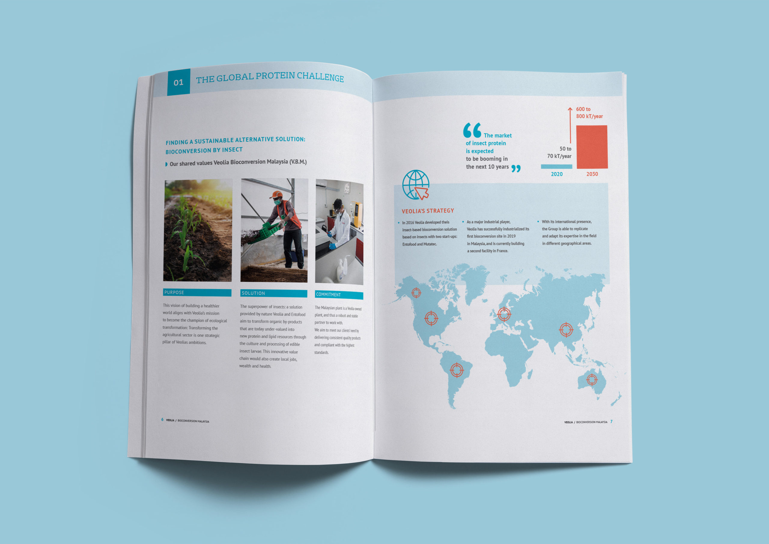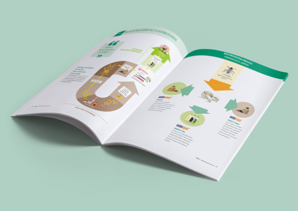 Les enjeux de notre client Transmettre, former, engager autour d’enjeux écologiques majeurs grâce au projet de bioconversion ENTOFOOD : produire une farine à base d’insectes pour nourrir bétail et animaux domestiques afin d’épargner les ressources animales de notre planète. Notre rôle Après nous être approprié le concept et les contenus pour les traduire graphiquement sous plusieurs formats de supports pédagogiques ou informatifs. Une identité visuelle a été créée spécifiquement pour ce projet. L’agence studio46, grâce à ses compétences dans le domaine scientifique et médical, a accompagné Veolia dans : • La mise en page du contenu en langue anglaise, • La hiérarchisation de ses données, • L’élaboration de schémas et d’infographies complexes illustrant et simplifiant le concept Entofood Et les résultats… Un concept mis à la portée de tous, une image valorisée ! L’identité visuelle conçue pour cette campagne a été déclinée sur de nombreux supports complémentaires : documents pédagogiques et didactiques à vocation commerciale, courriers d’accompagnement, brochure de 20 pages, supports de présentation orale, guide de formation en présentiel pour les responsables d’équipes.